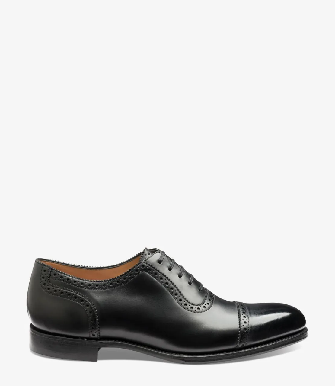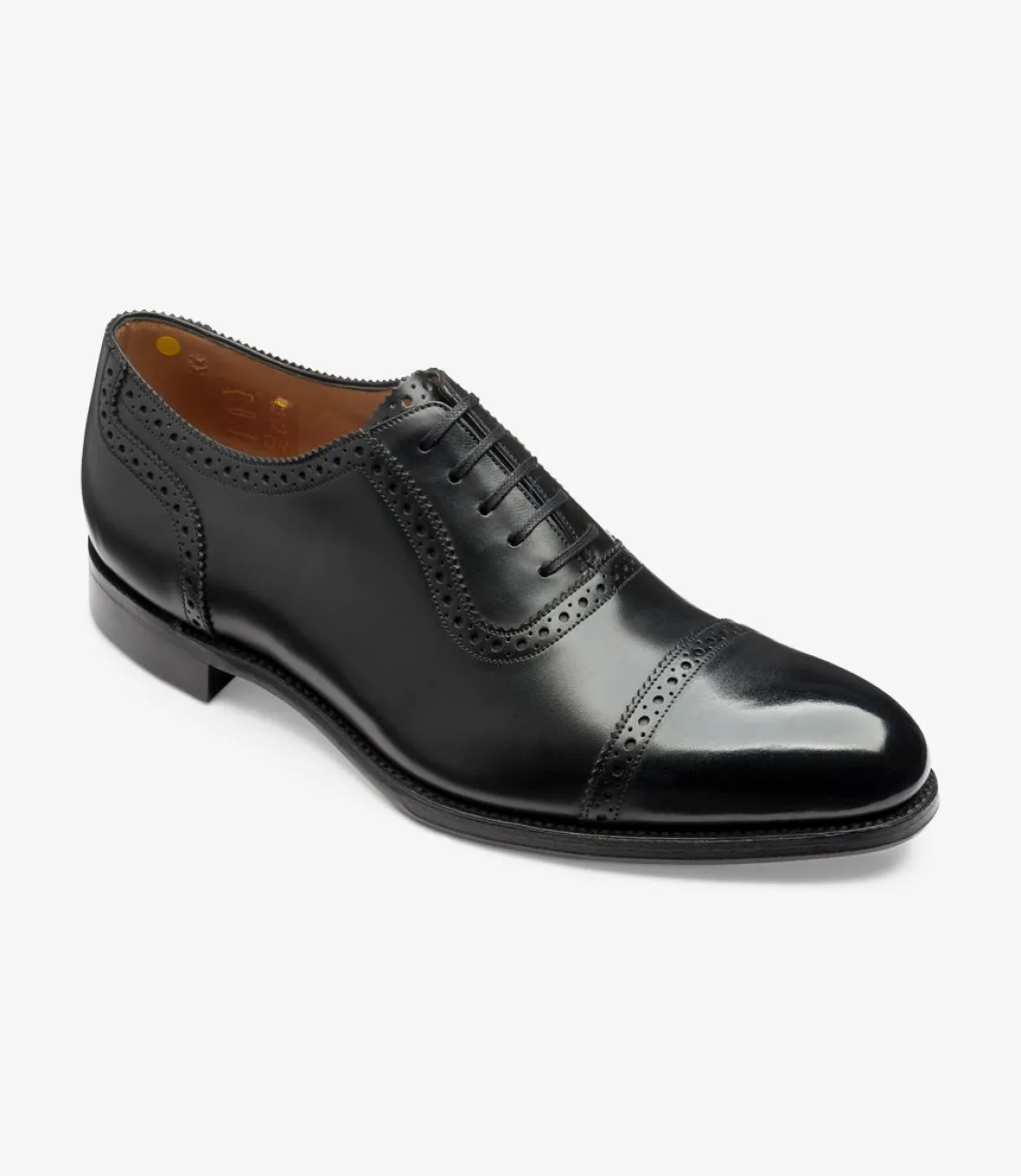 Handmade in Northamptonshire on our Tower last, Trinity is stylish and versatile Semi-Brogue shoe in an Oxford design.rnDelivering a well-proportioned fit, Trinity features a distinctive, almond-shaped toe and a highly-sculpted fiddle-back waist for a more refined and elegant shape with increased arch-support. Heels are built using veg-tanned leather and premium leather linings provide maximum absorption and optimum foot comfort. The finished shoes are hand-burnished and finger-polished for a deep, rich shine while fully-stitched Goodyear welted leather soles are intricately hand-decorated and reveal a painted two-tone stain.rnTrinity is available in Onyx Black calf leather.